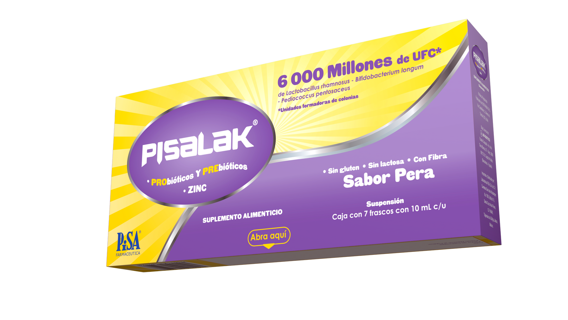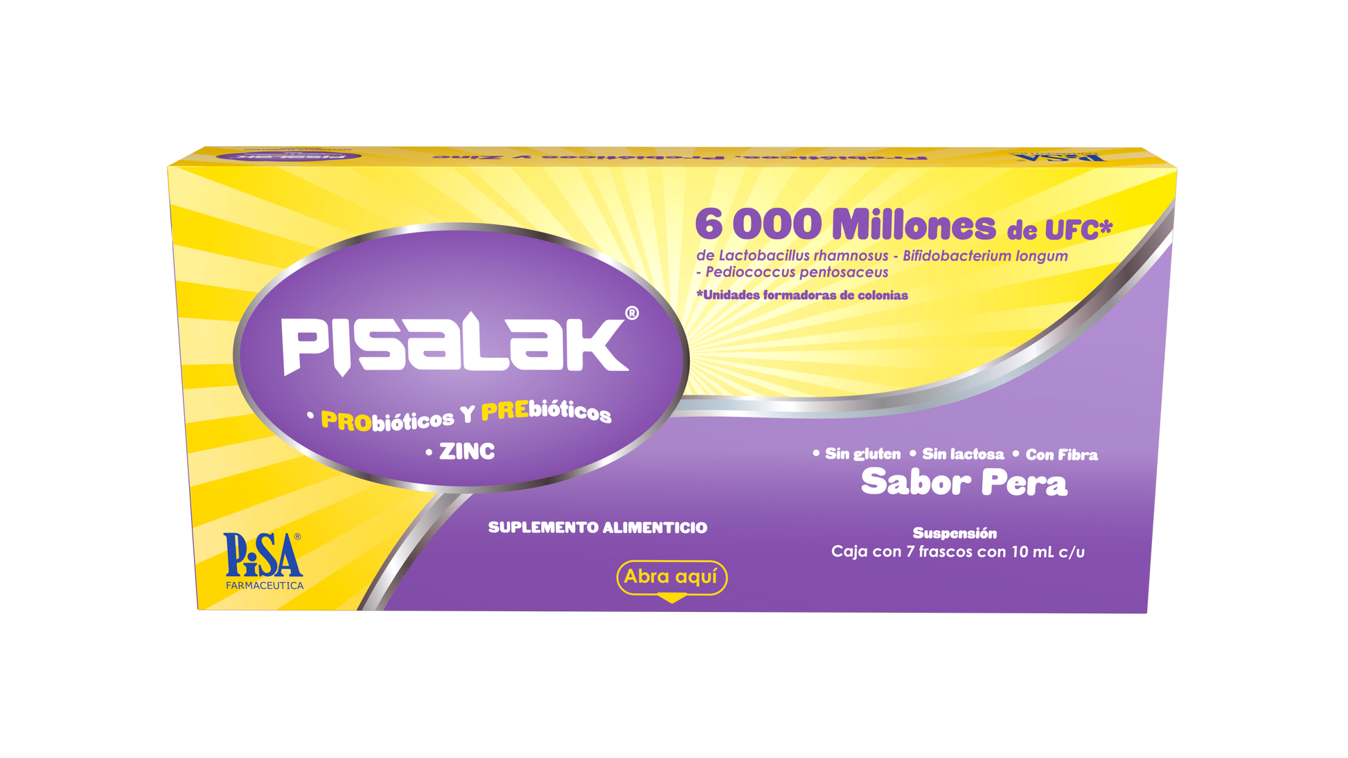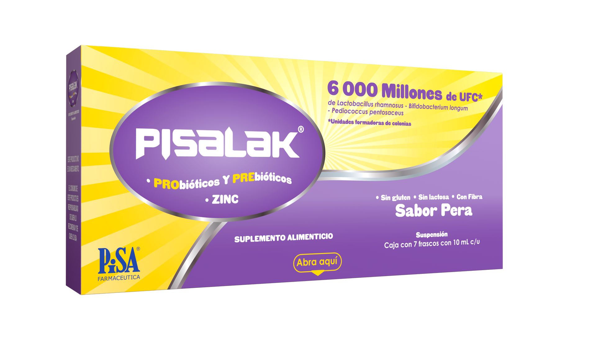 Pisalak es un suplemento alimenticio de alta potencia, desarrollado por Laboratorio Pisa, formulado con probióticos y zinc. Su principal función es regenerar la flora intestinal alterada por episodios de diarrea, infecciones o tratamientos con antibióticos. Gracias a sus cepas especializadas y su contenido de zinc, restaura el equilibrio digestivo, mejora la absorción de nutrientes y fortalece el sistema inmunológico.